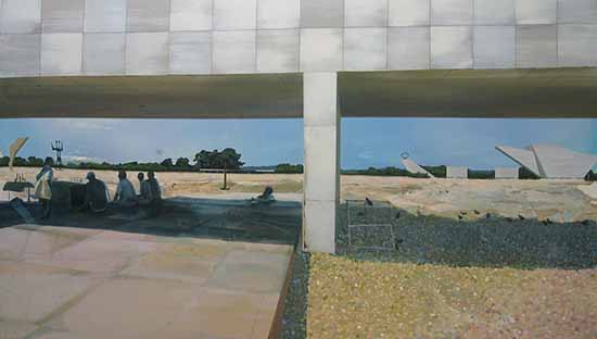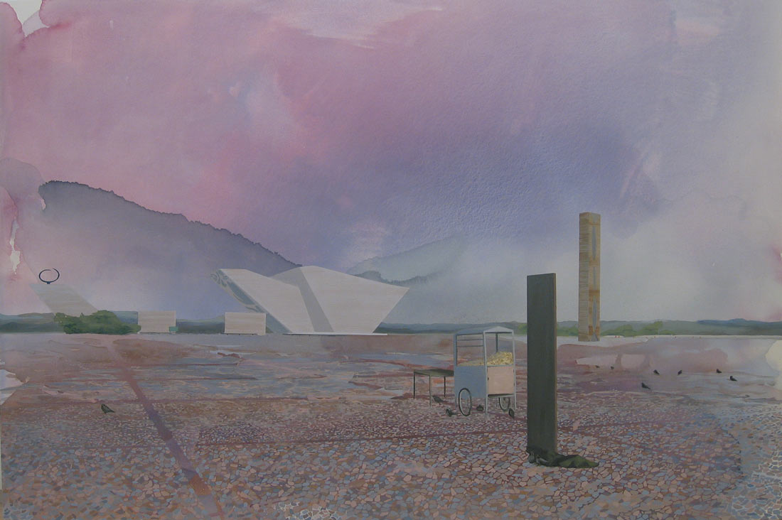 Angelina Gualdoni’s paintings have a disaffecting, almost apocalyptic quality that is formally balanced by beautiful textures and colors as well as the shapes of modernist architecture. Gualdoni’s interest lies in the entropic decay and destruction of these buildings, which often reflected utopian designs for the future when they were constructed. Taking the city of Brasilia as a case study for this exhibition, she depicts government buildings and monuments located in the Praça dos Tres Poderes (Square of the Three Powers) to see how many mid-century building designs and urban plans function today.
