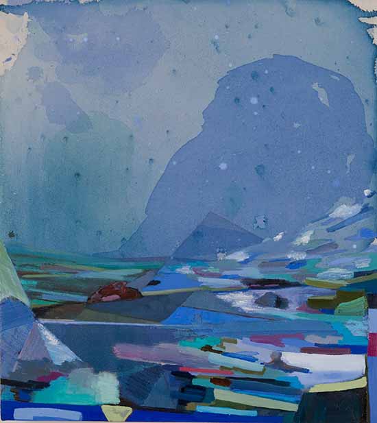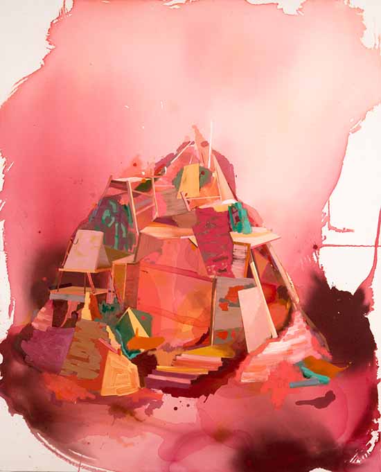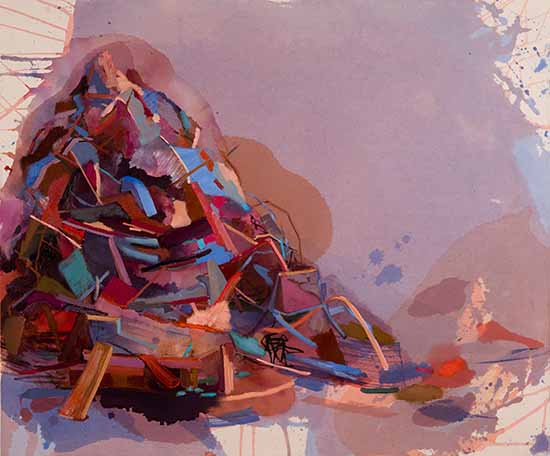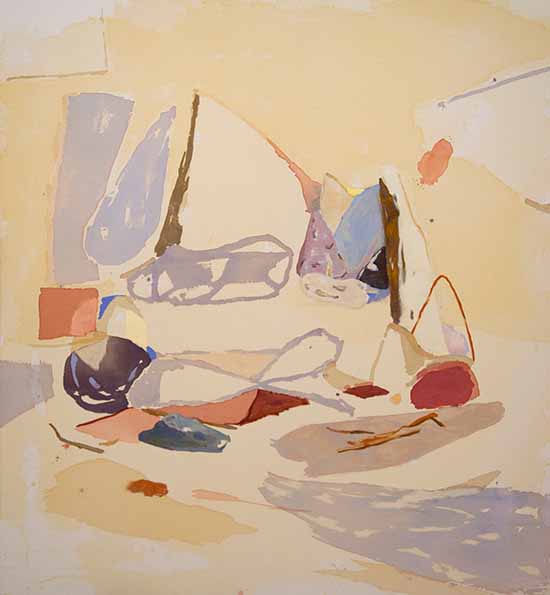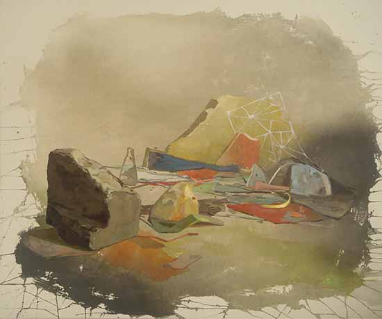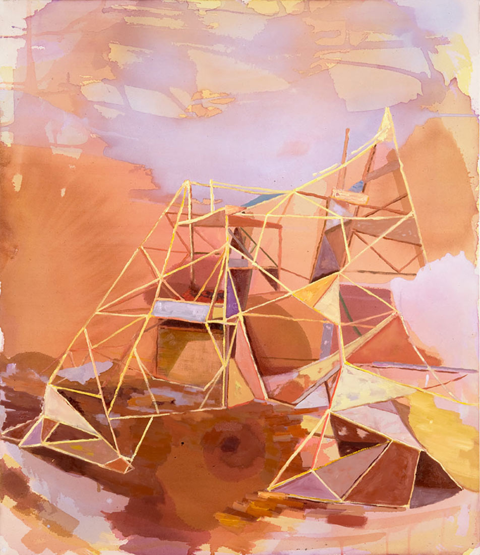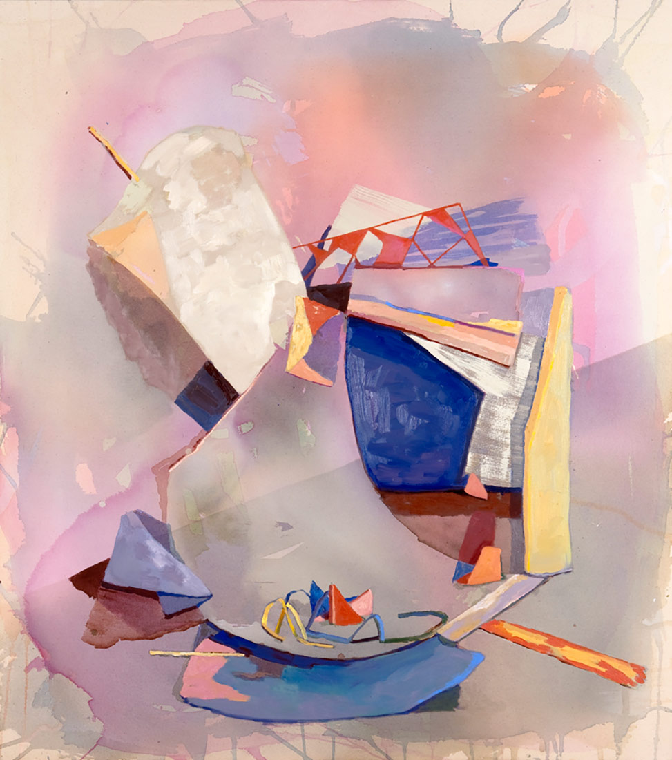 In "Proposals for Remnants", Gualdoni depicts groupings and configurations of detritus, allowing room for exploration with paint, surface and abstraction. She molds shapes and ephemera, using them as the basis for invented constructions. Pilings hint to the architectural and optimistic influences of Buckminster Fuller and humble sculptural paper assemblages represent liminal spaces between the abstract and the representational. These paintings, while less specific to architectural conditions, are more representative of a subjective emotional and psychological read and offer a connection to our current conditions that call for making-do with what is at hand.