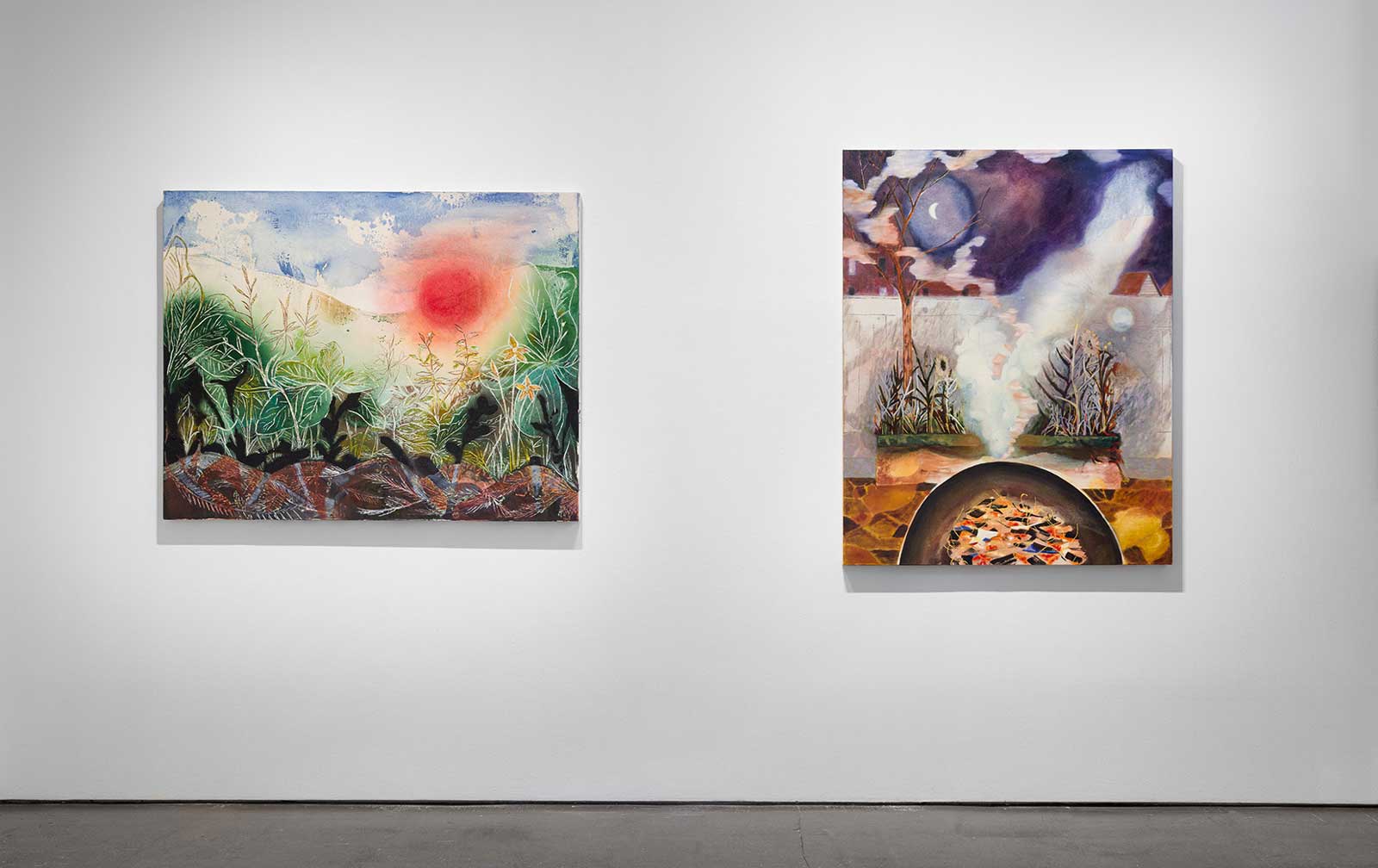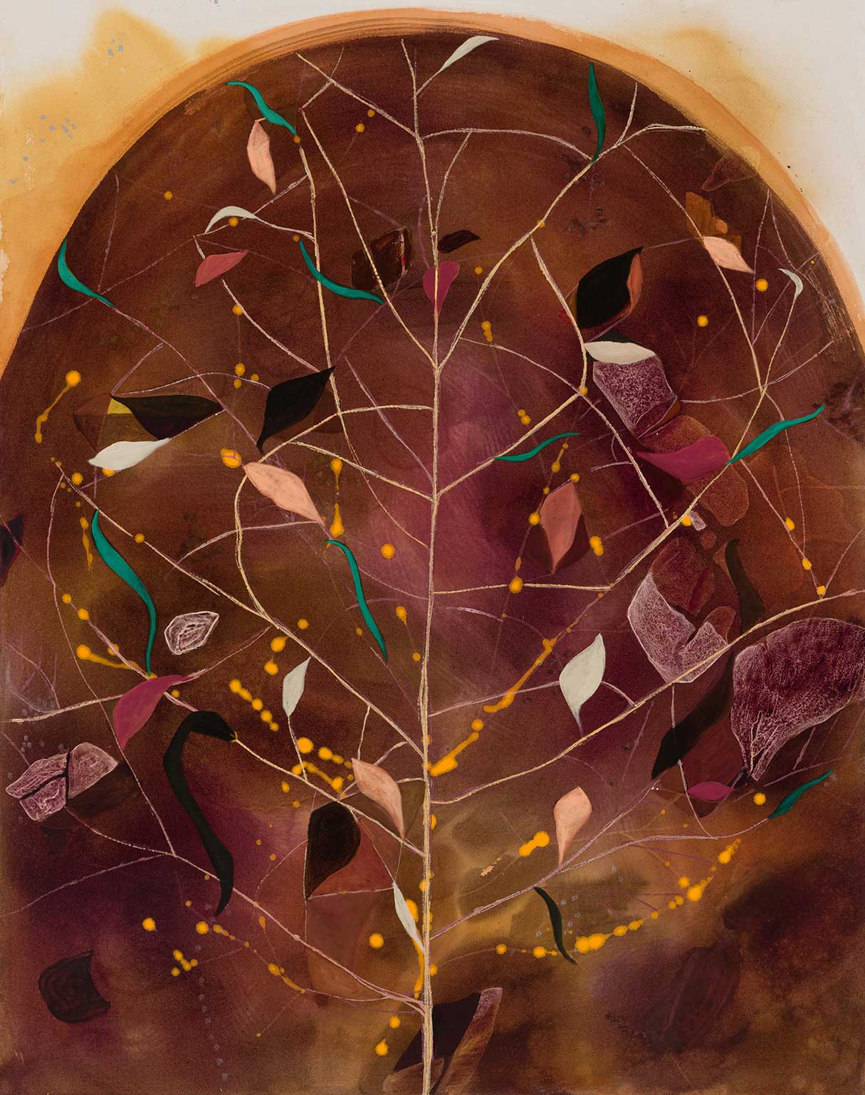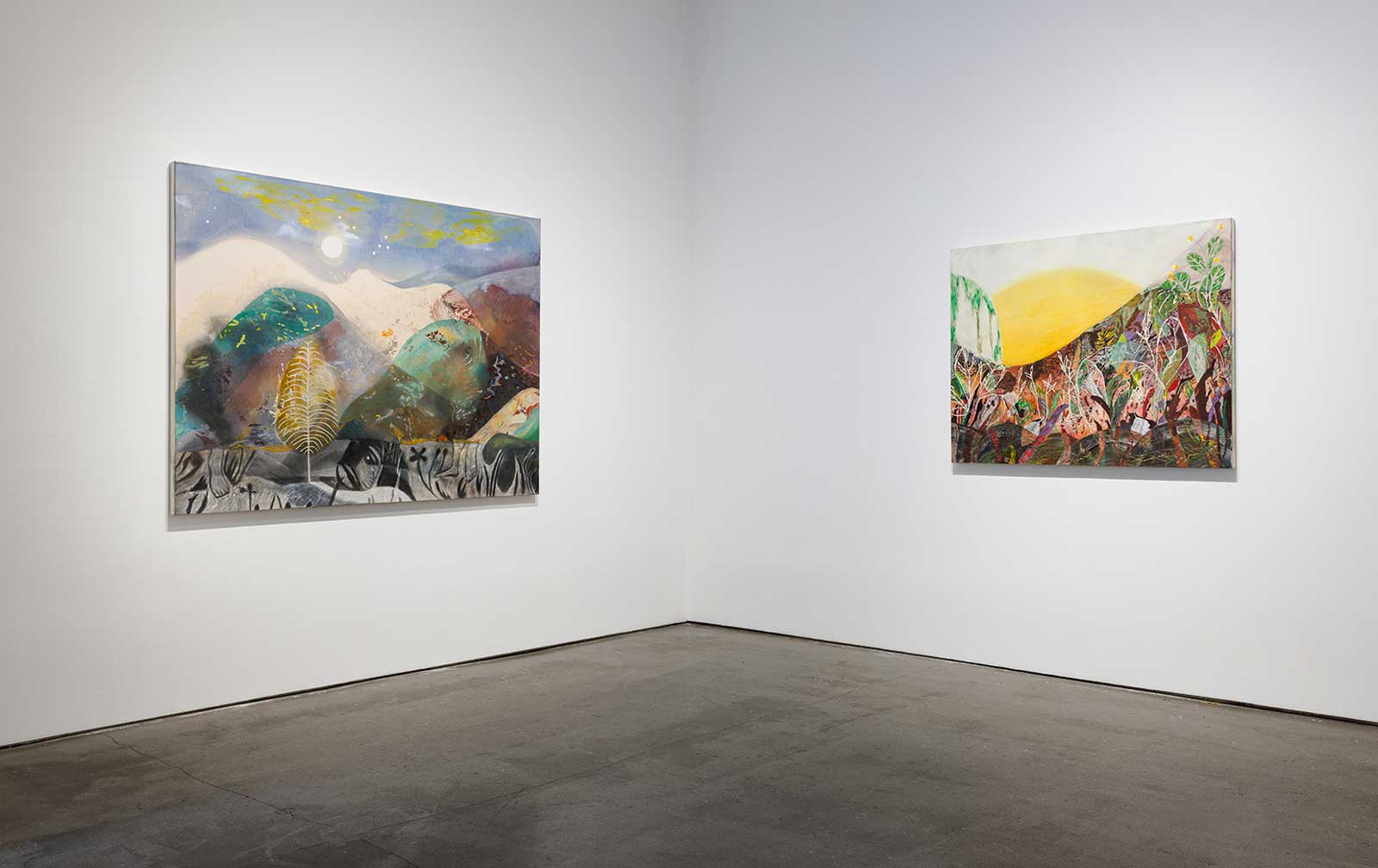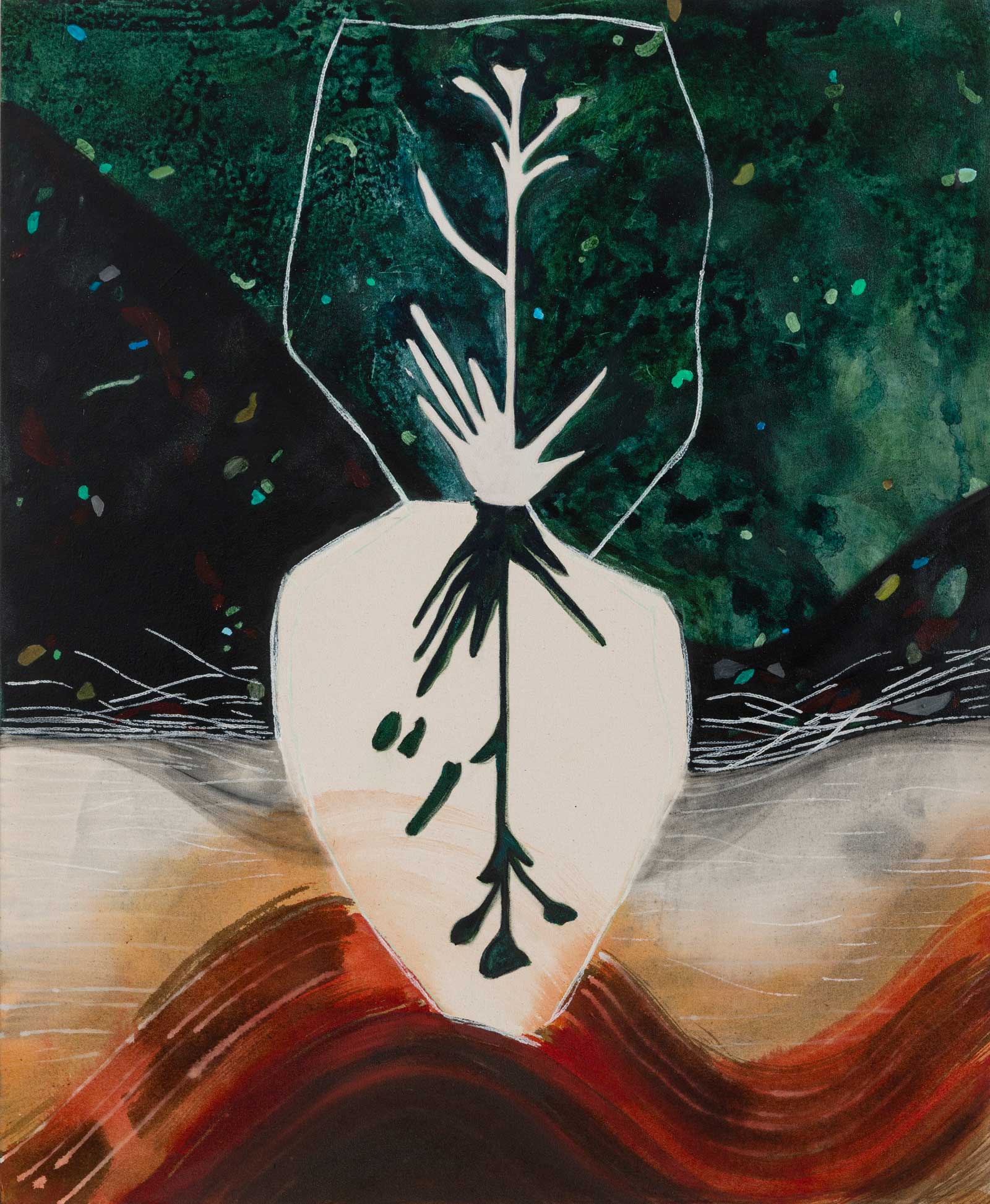 Juxtaposing expansive stained and poured grounds with descriptive contour renderings of plants, Gualdoni renders domestic and imagined landscapes where abstract veils of paint become metaphors for forces outside of our control that shape our experience, whether environmental, economic, or metaphysical.