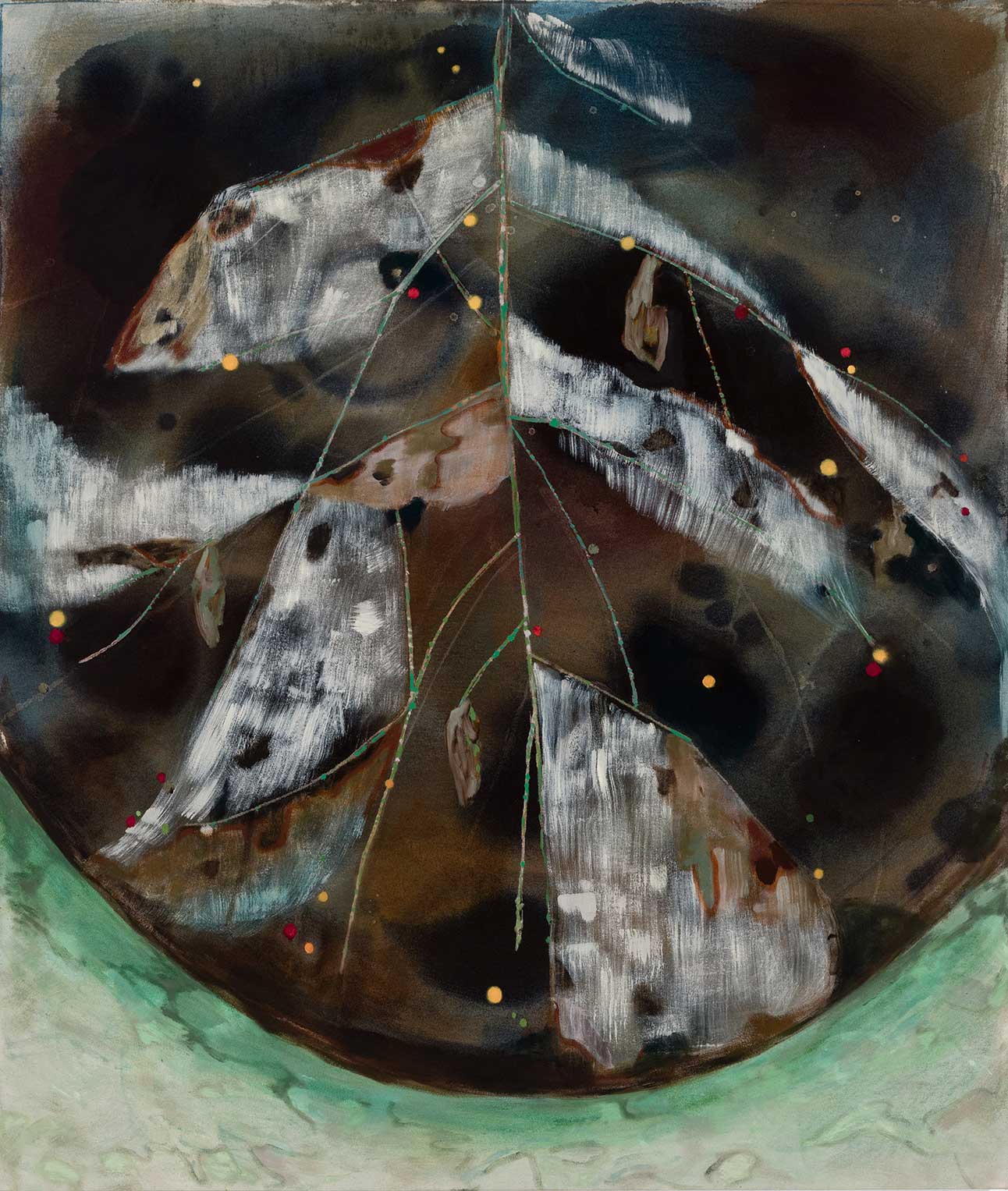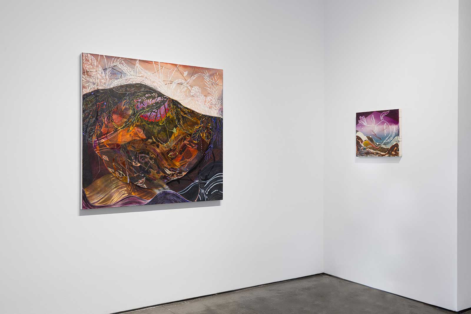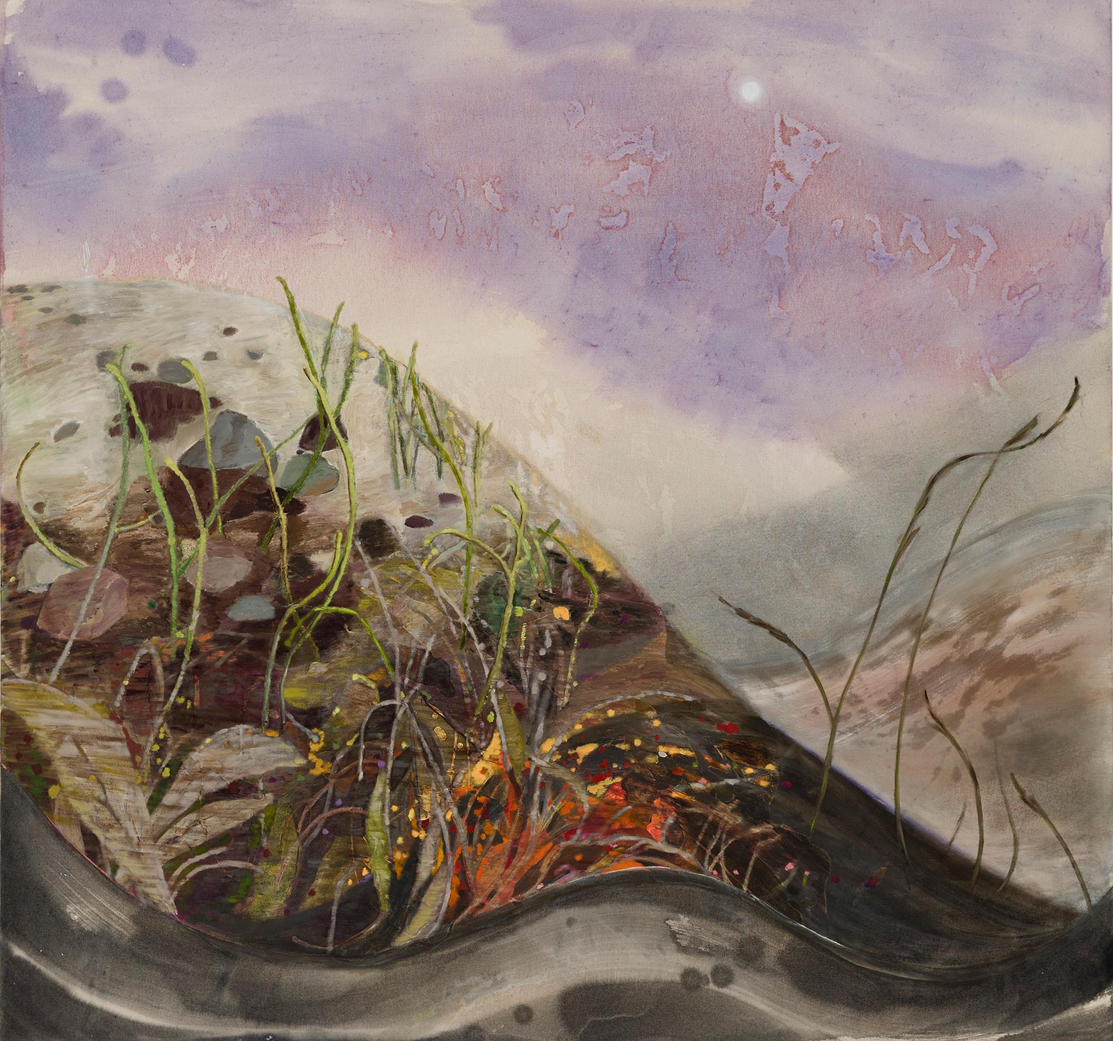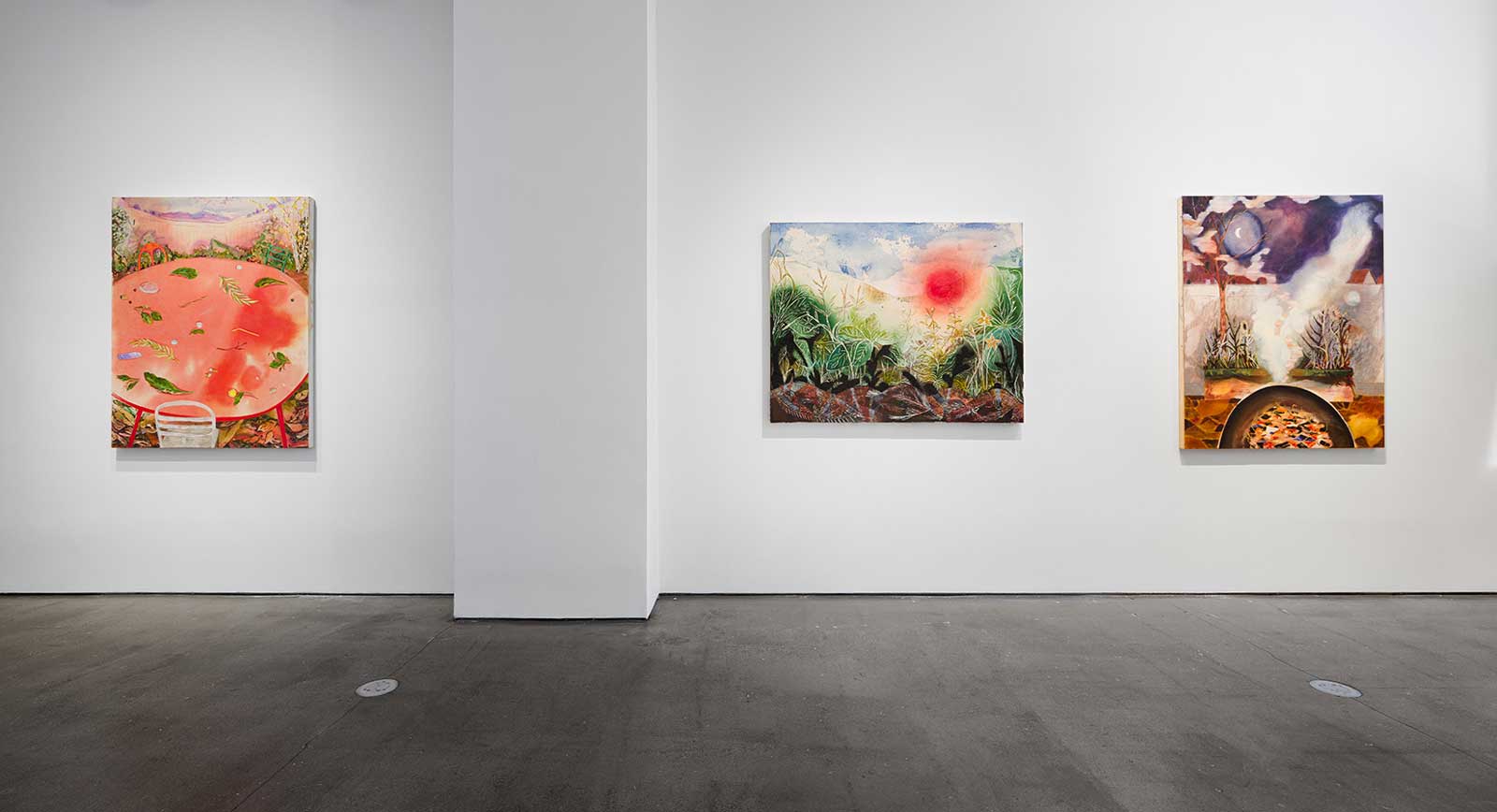 Juxtaposing expansive stained and poured grounds with descriptive contour renderings of plants, Gualdoni renders domestic and imagined landscapes where abstract veils of paint become metaphors for forces outside of our control that shape our experience, whether environmental, economic, or metaphysical.