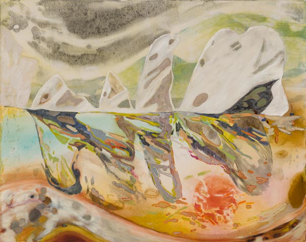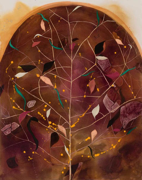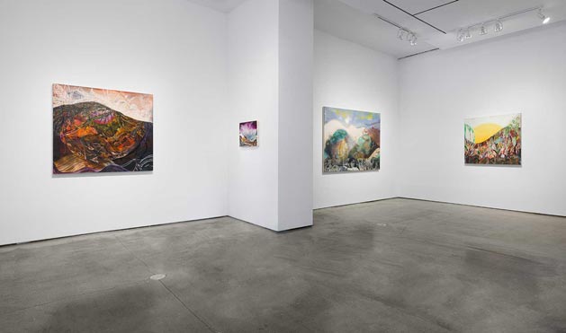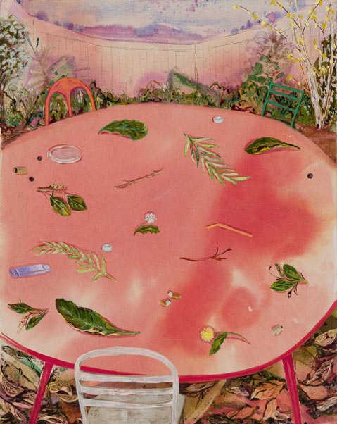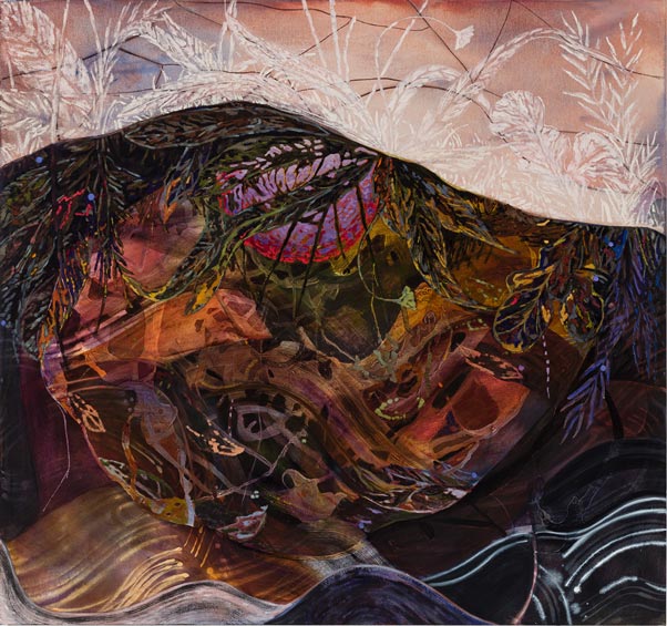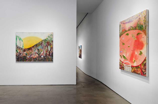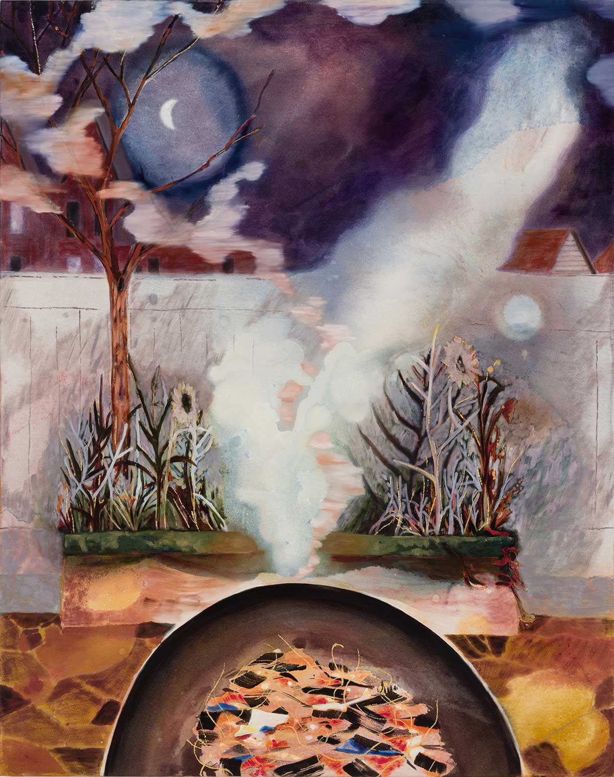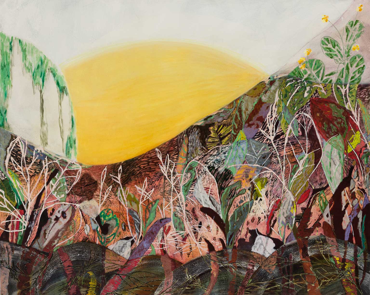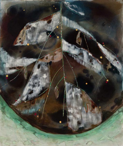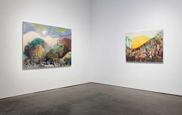 Juxtaposing expansive stained and poured grounds with descriptive contour renderings of plants, Gualdoni renders domestic and imagined landscapes where abstract veils of paint become metaphors for forces outside of our control that shape our experience, whether environmental, economic, or metaphysical.