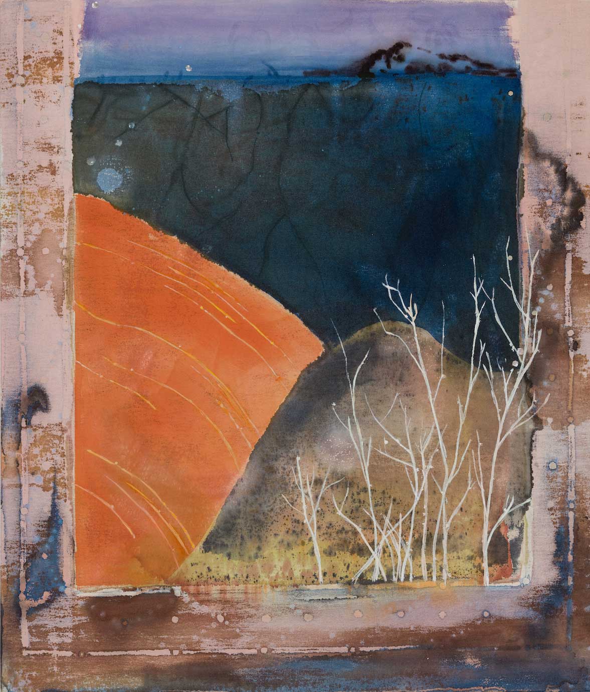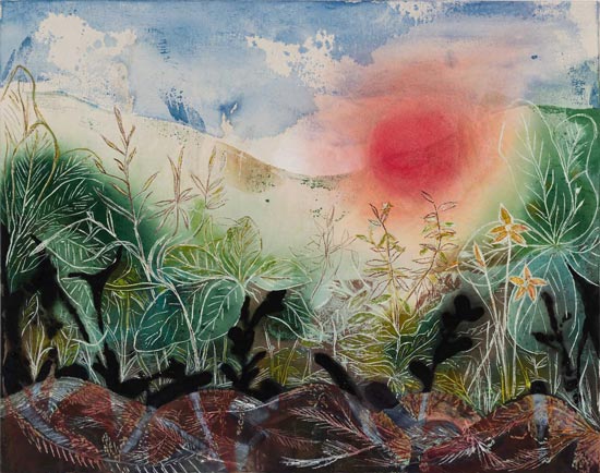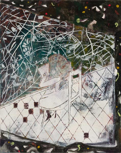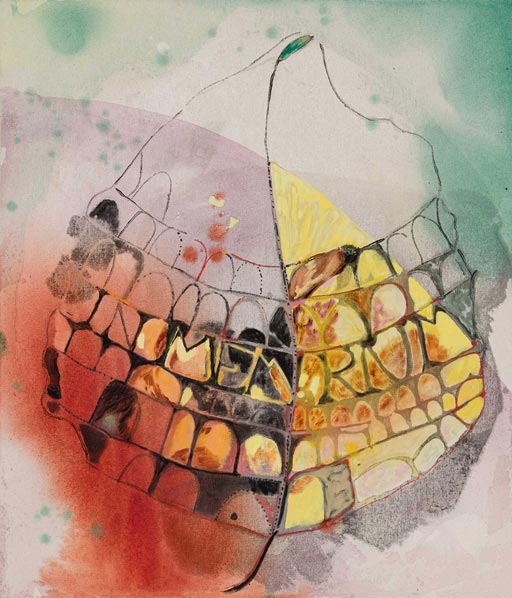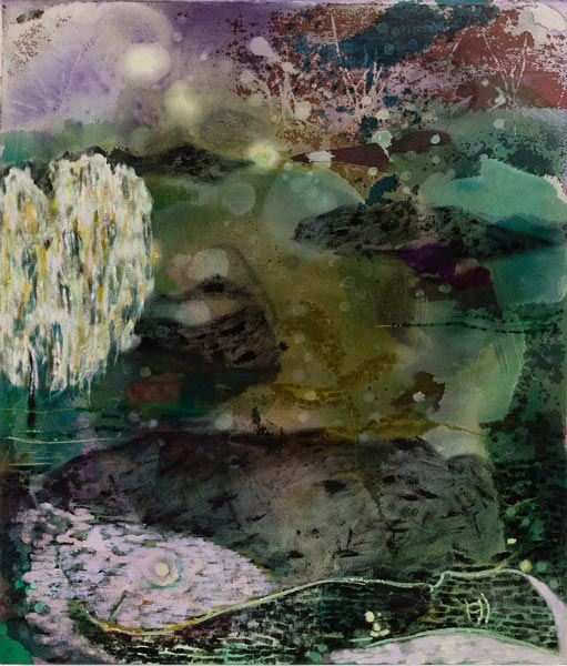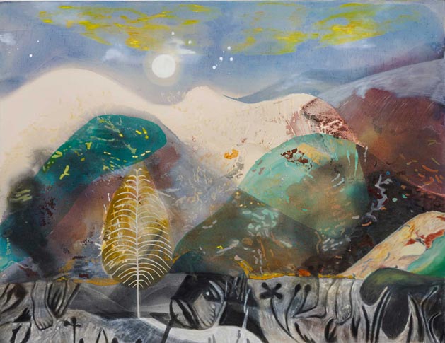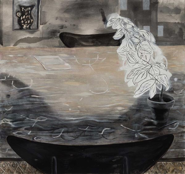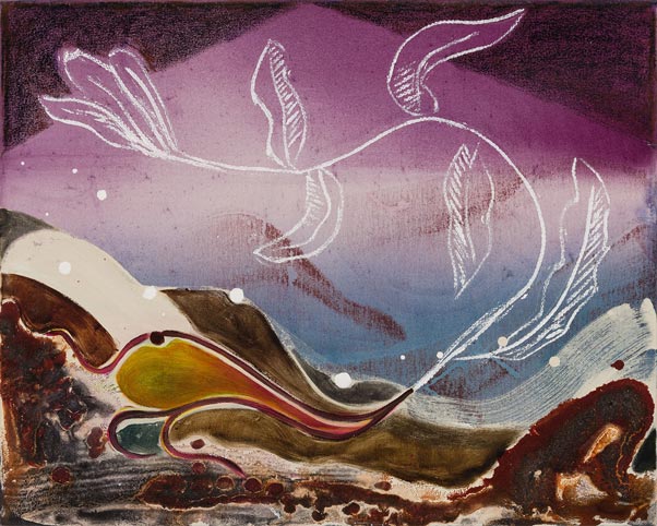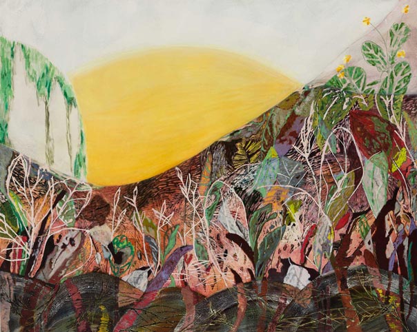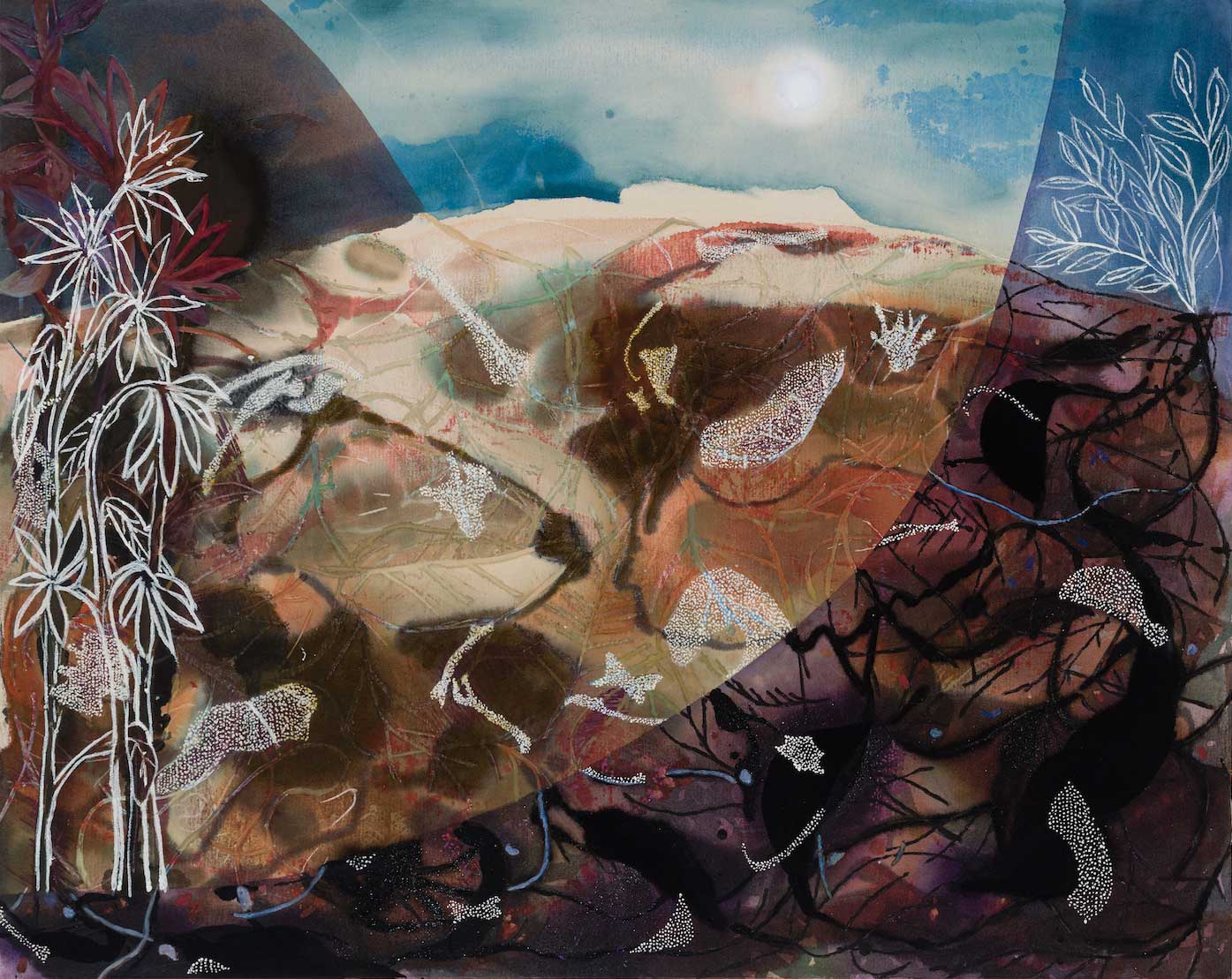 Juxtaposing expansive stained and poured grounds with descriptive contour renderings of plants, Gualdoni renders domestic and imagined landscapes where abstract veils of paint become metaphors for forces outside of our control that shape our experience, whether environmental, economic, or metaphysical.