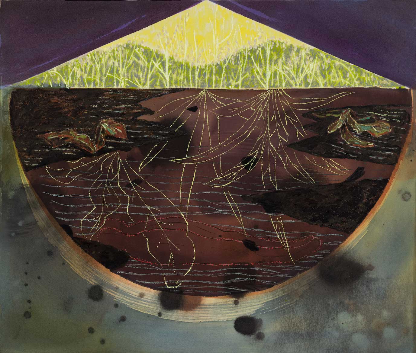 In Verso della Terra, Gualdoni reflects on how we read landscapes, both above and below the surface level. Drawing on alchemical symbolism and Jungian psychology to describe and diagram landscapes, Gualdoni invites viewers to contemplate how decay and regeneration co-locate in the rhizosphere - the layer of soil where roots grow, where networks extend between fungal colonies and tree roots. This layer of soil functions as a trove of unseen physical and psychological support structures, reminding us that all above relies on that below.